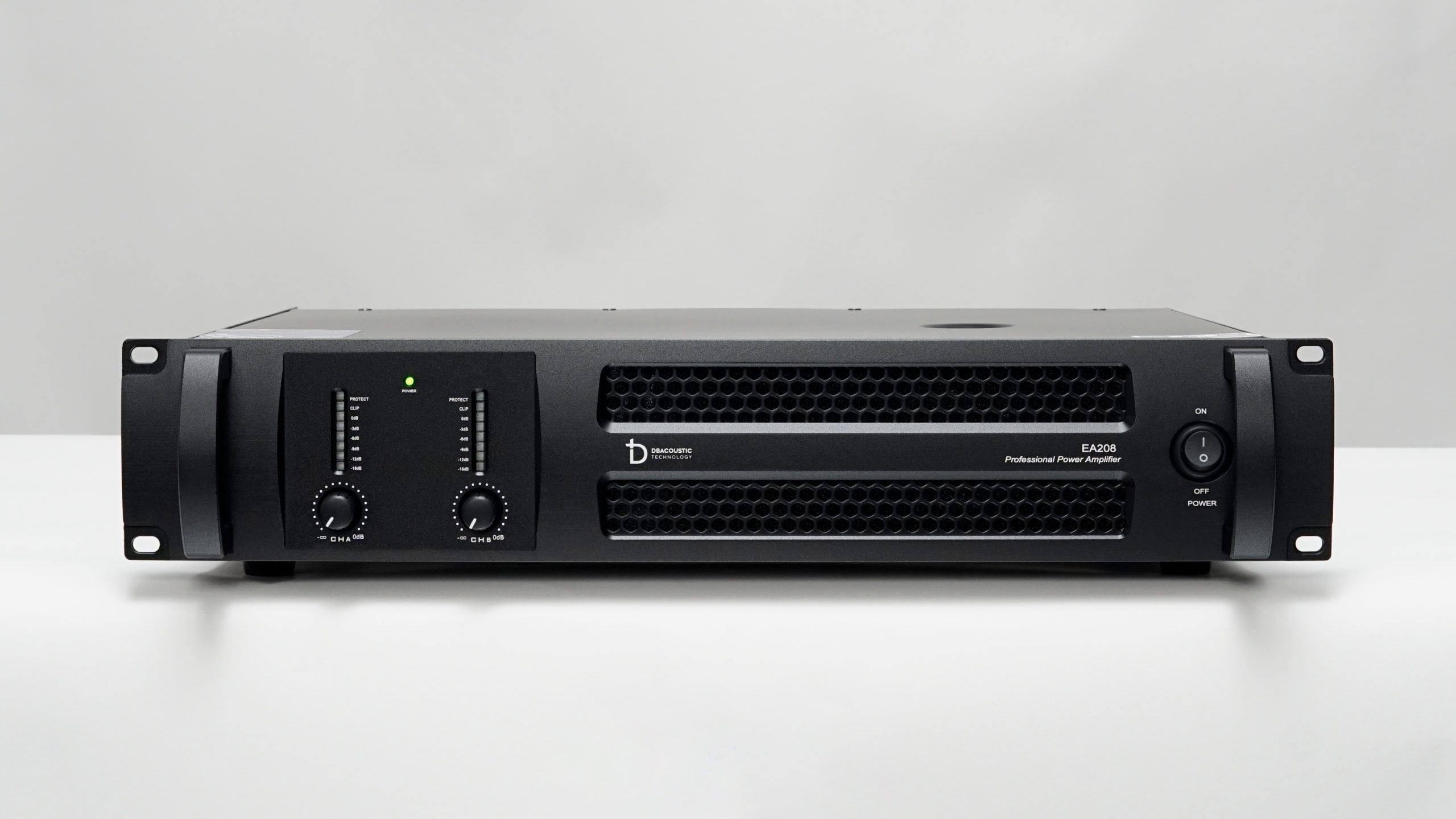 EA208 có thiết kế 2U nhỏ gọn, kích thước 482 x 366 x 90 mm, phù hợp mọi tủ rack tiêu chuẩn. Tone đen chủ đạo kết hợp mặt trước nhôm phay sang trọng cùng hệ thống LED hiển thị trạng thái (Signal, Clip, Protect) giúp kiểm soát hoạt động dễ dàng.