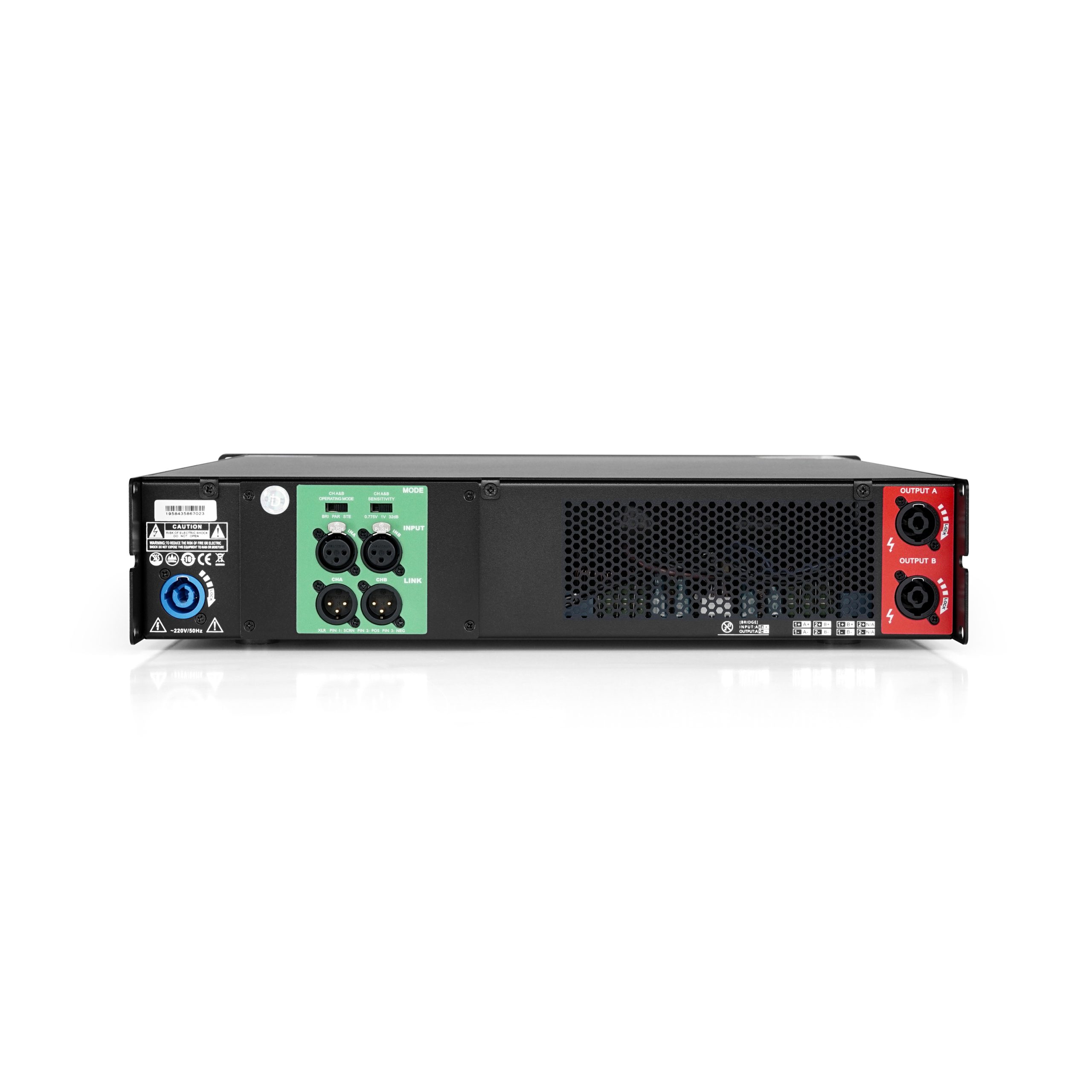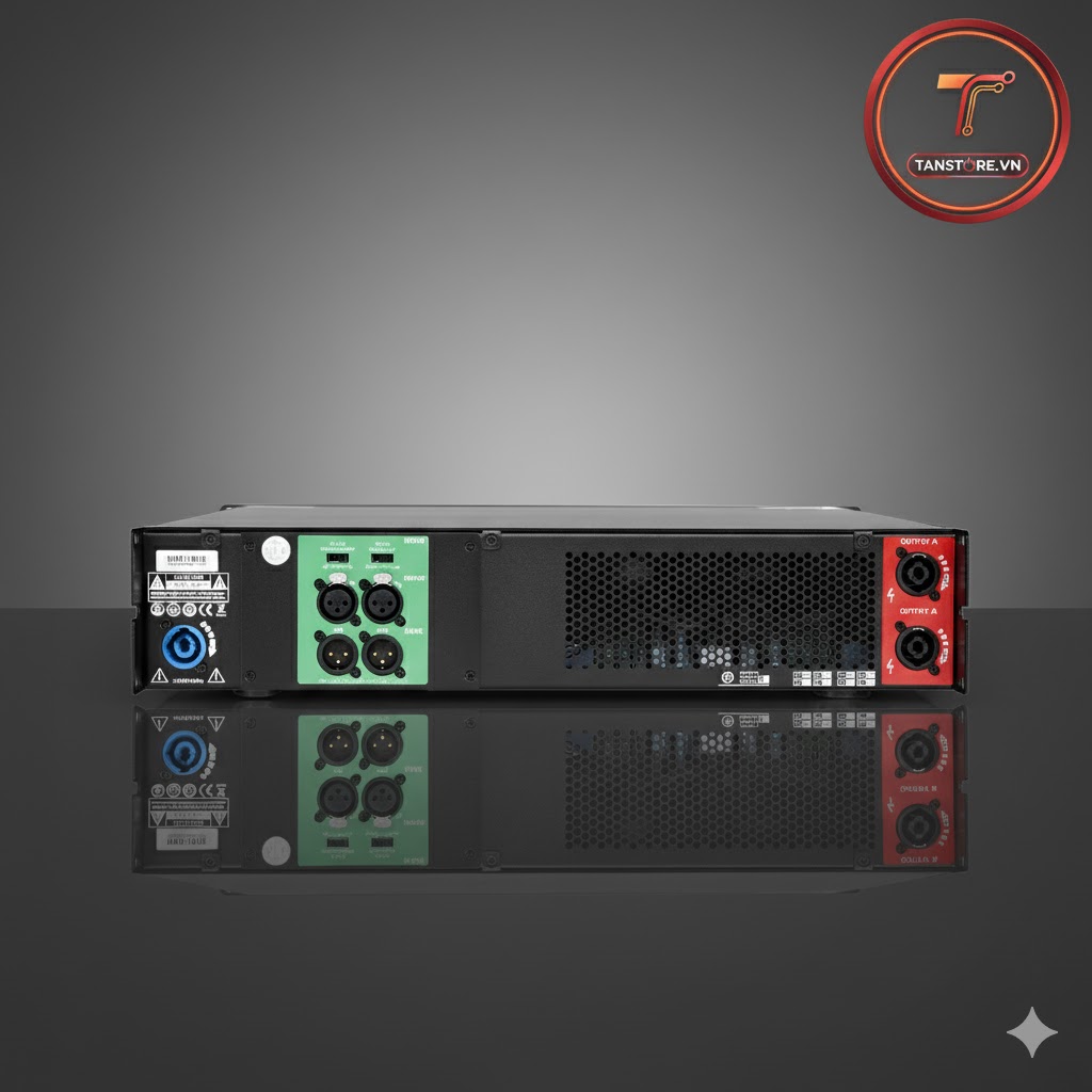 Phía sau bố trí quạt tản nhiệt công suất lớn, cổng Neutrik Speakon, XLR input/output tiêu chuẩn, giúp kết nối nhanh và an toàn trong môi trường âm thanh chuyên nghiệp.