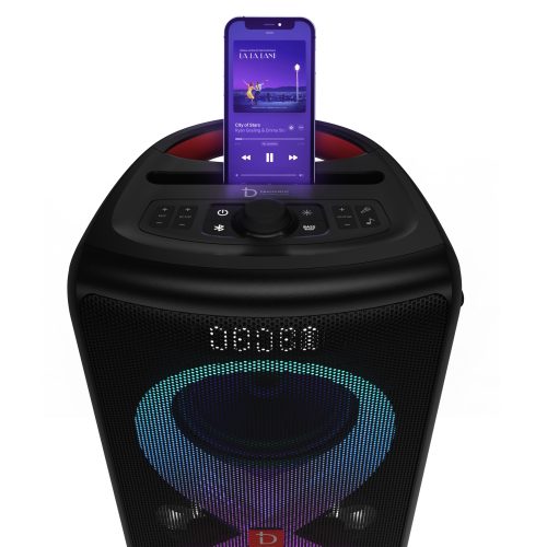 Toàn bộ thân loa được chế tác từ nhựa cao cấp kết hợp tấm ê-căng kim loại – vừa chắc chắn, vừa tăng tính thẩm mỹ. Đặc biệt, đèn LED RGB đa sắc tích hợp ở hai vành bass, có thể thay đổi theo nhạc, tạo nên không gian sôi động và cuốn hút trong mọi buổi tiệc.