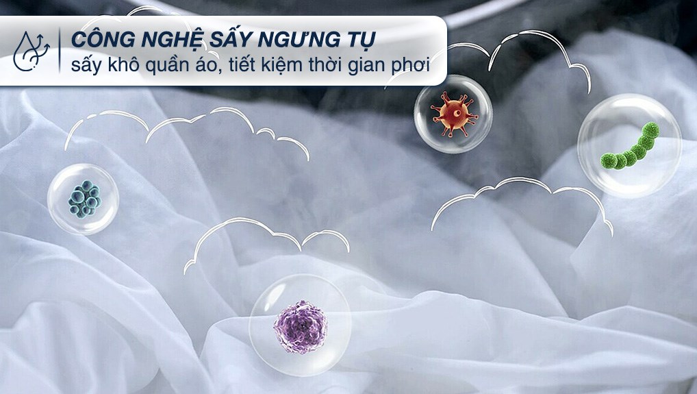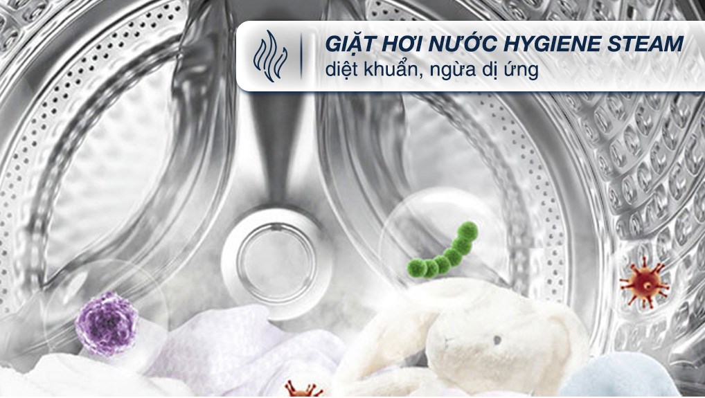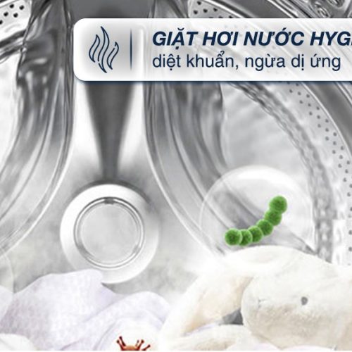 – Công nghệ giặt hơi nước Hygiene Steam tạo ra hơi nước nóng giúp diệt 99.9% vi khuẩn và các tác nhân gây dị ứng đảm bảo sức khỏe cho gia đình.