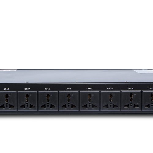Mặt sau: Gồm 8 ổ cắm nguồn chính (CH1–CH8), 1 cổng RS232 và 1 ổ phụ luôn có điện.